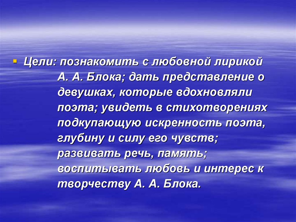 Цели: познакомить с любовной лирикойА. А. Блока; дать представление о