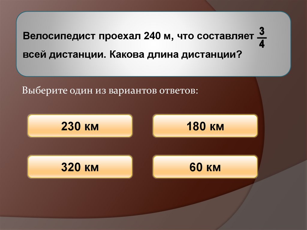 Велосипедист проехал 240 м, что составляетвсей дистанции. Какова длина дистанции?