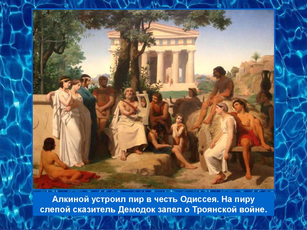Алкиной устроил пир в честь Одиссея. На пируслепой сказитель Демодок запел о Троянской войне.