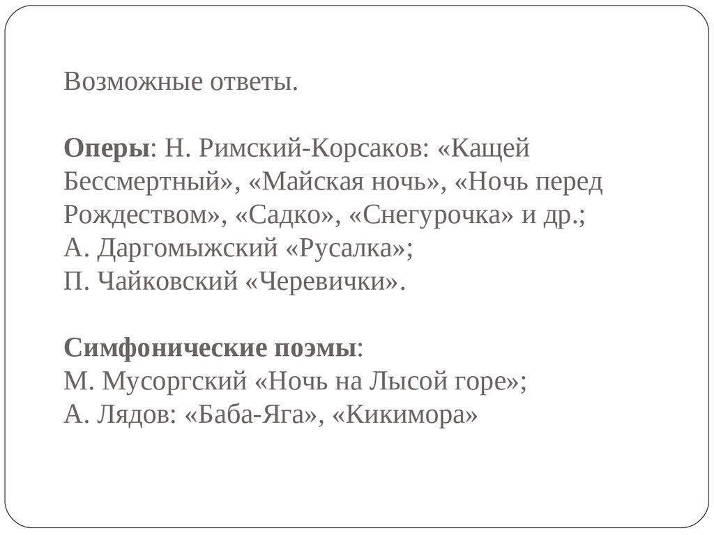 Возможные ответы.Оперы: Н. Римский-Корсаков: «Кащей