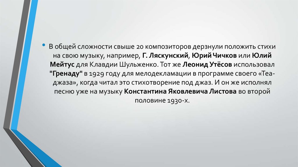 "Гренаду" в 1929 году для мелодекламации в программе своего «Теаджаза», когда читал это стихотворение под джаз. И он же исполнял
