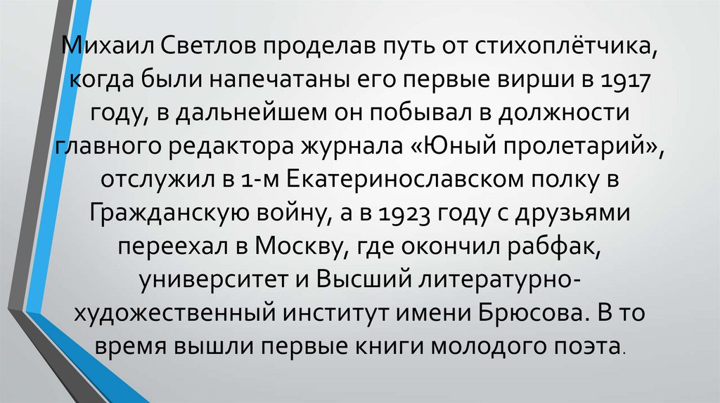 Михаил Светлов проделав путь от стихоплётчика,когда были напечатаны его первые вирши в 1917