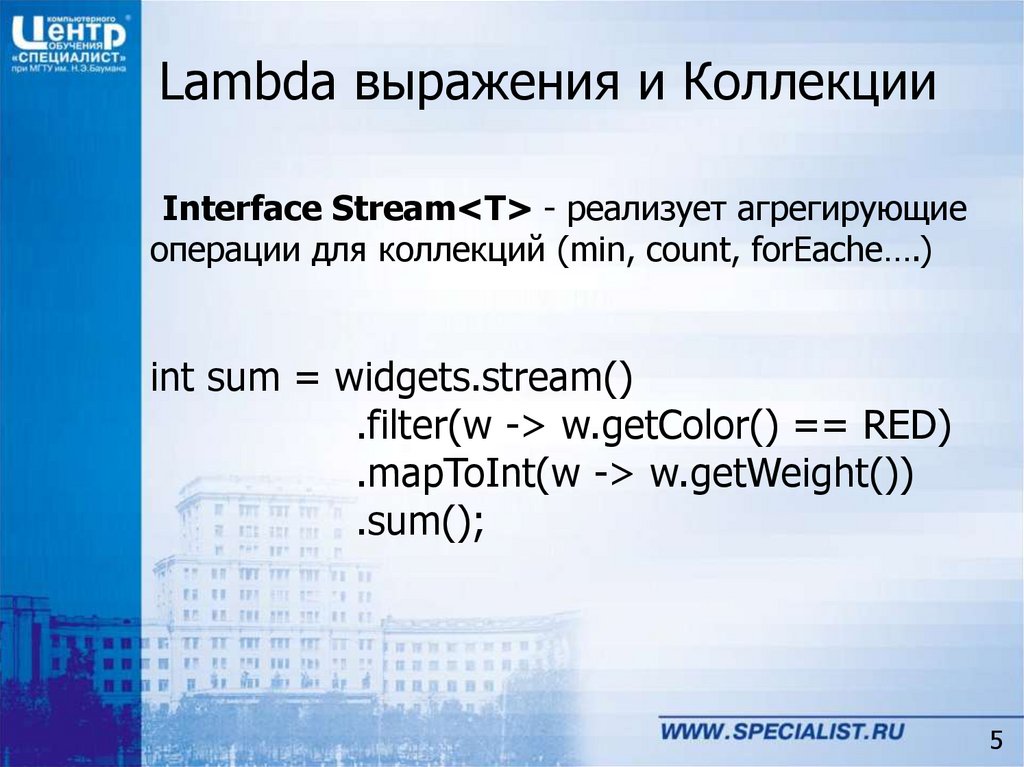 Lambda выражения и КоллекцииInterface Stream<T> - реализует агрегирующие