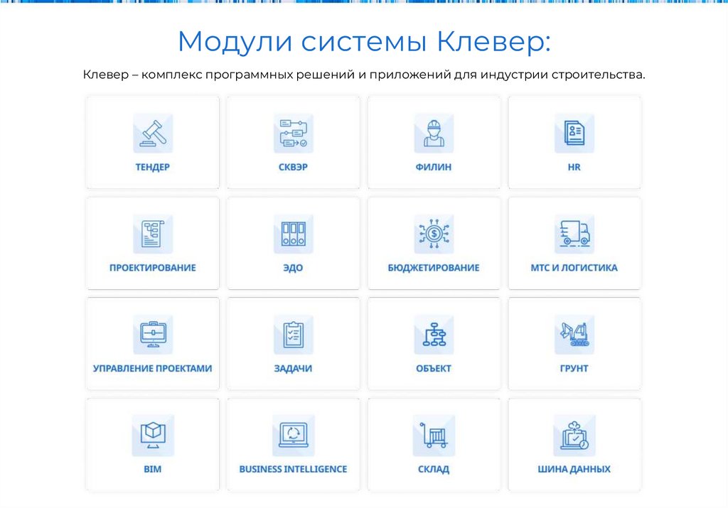 Модули системы Клевер:Клевер – комплекс программных решений и приложений для индустрии строительства.
