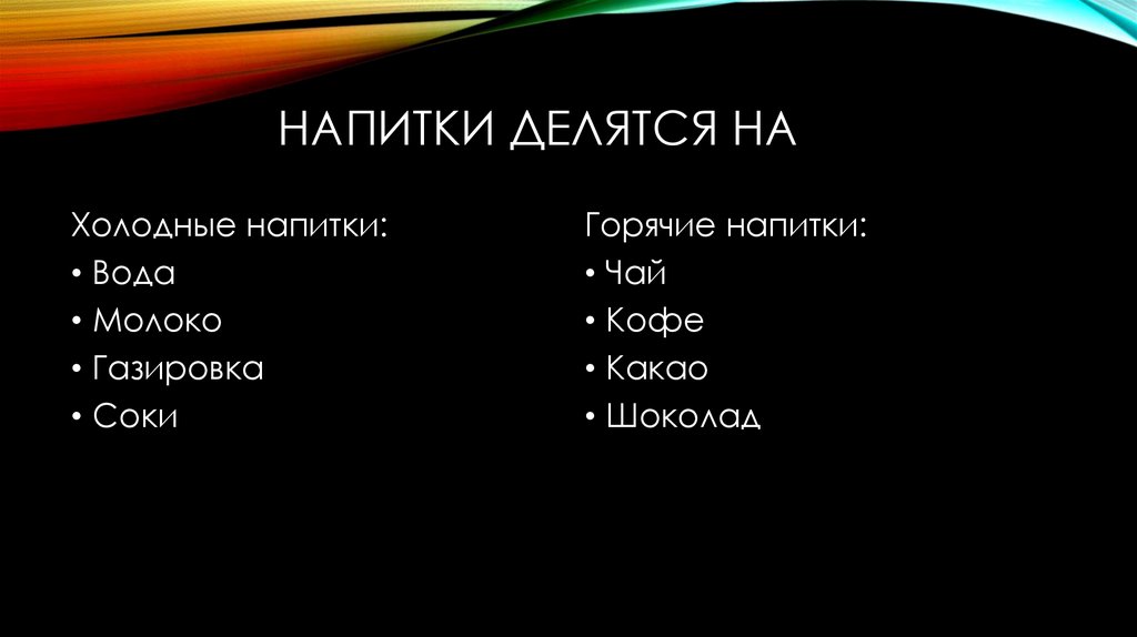 НАПИТКИ ДЕЛЯТСЯ НАХолодные напитки: