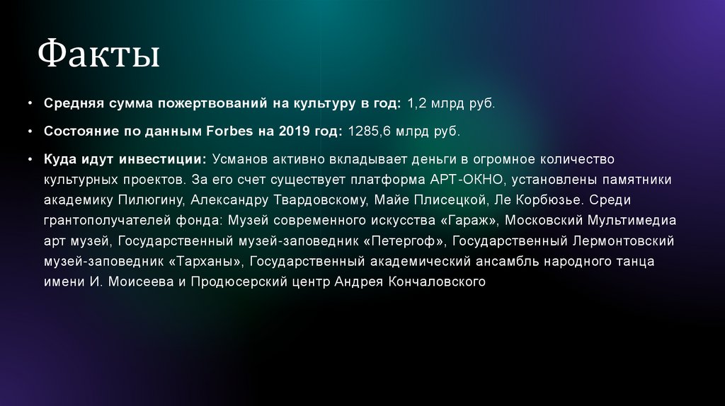 Факты• Средняя сумма пожертвований на культуру в год: 1,2 млрд руб.