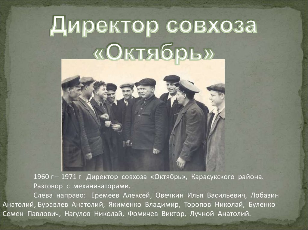 1960 г – 1971 г Директор совхоза «Октябрь», Карасукского района.Разговор с механизаторами.