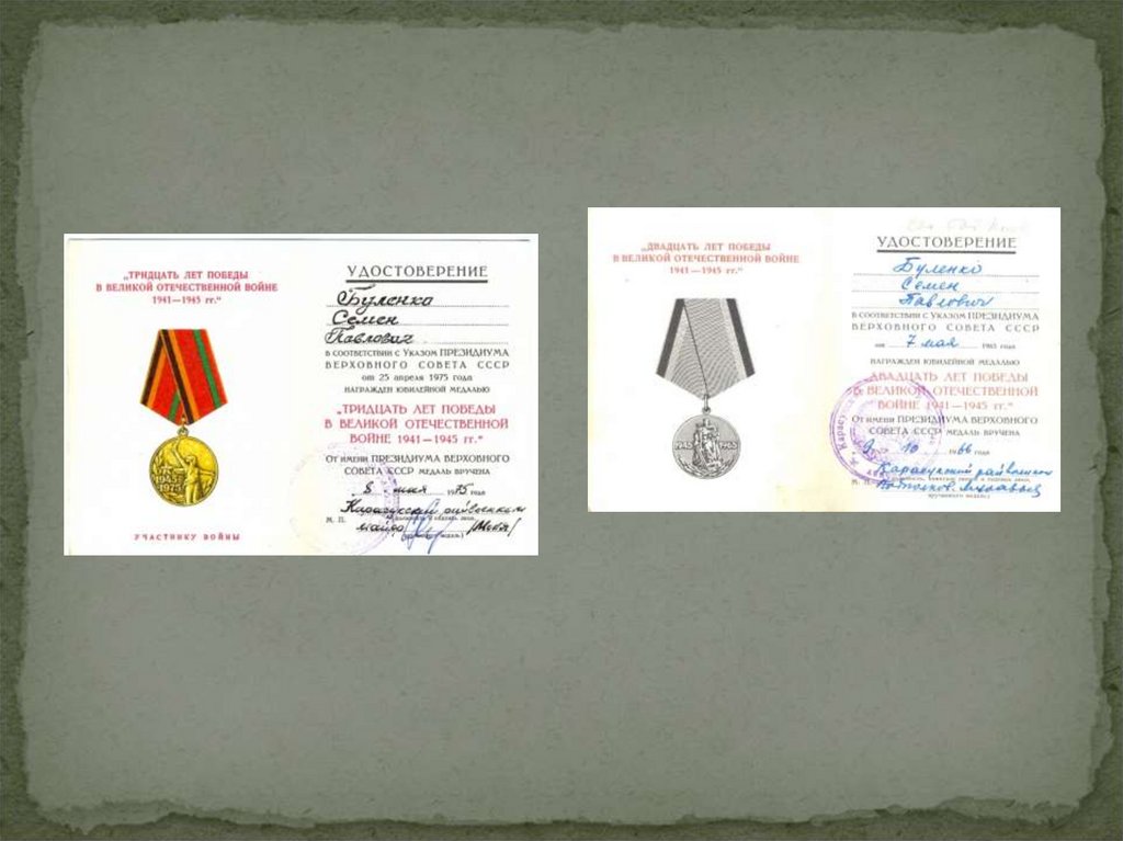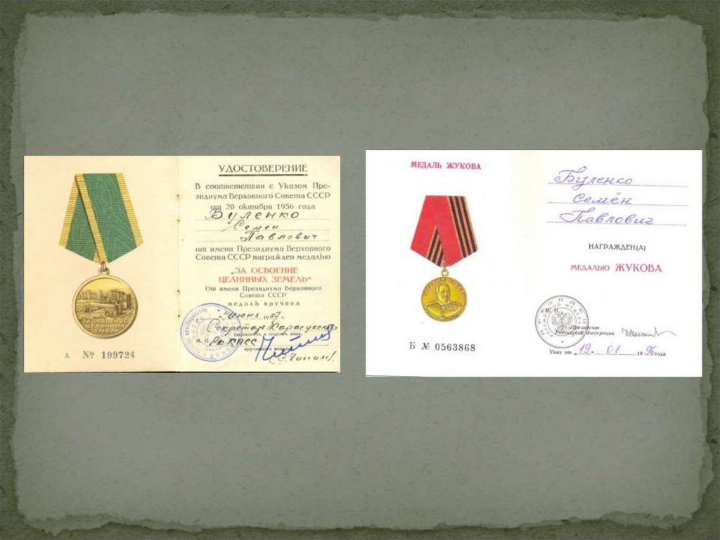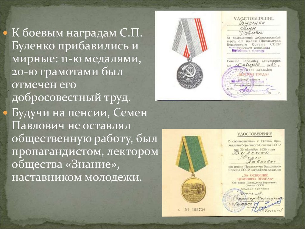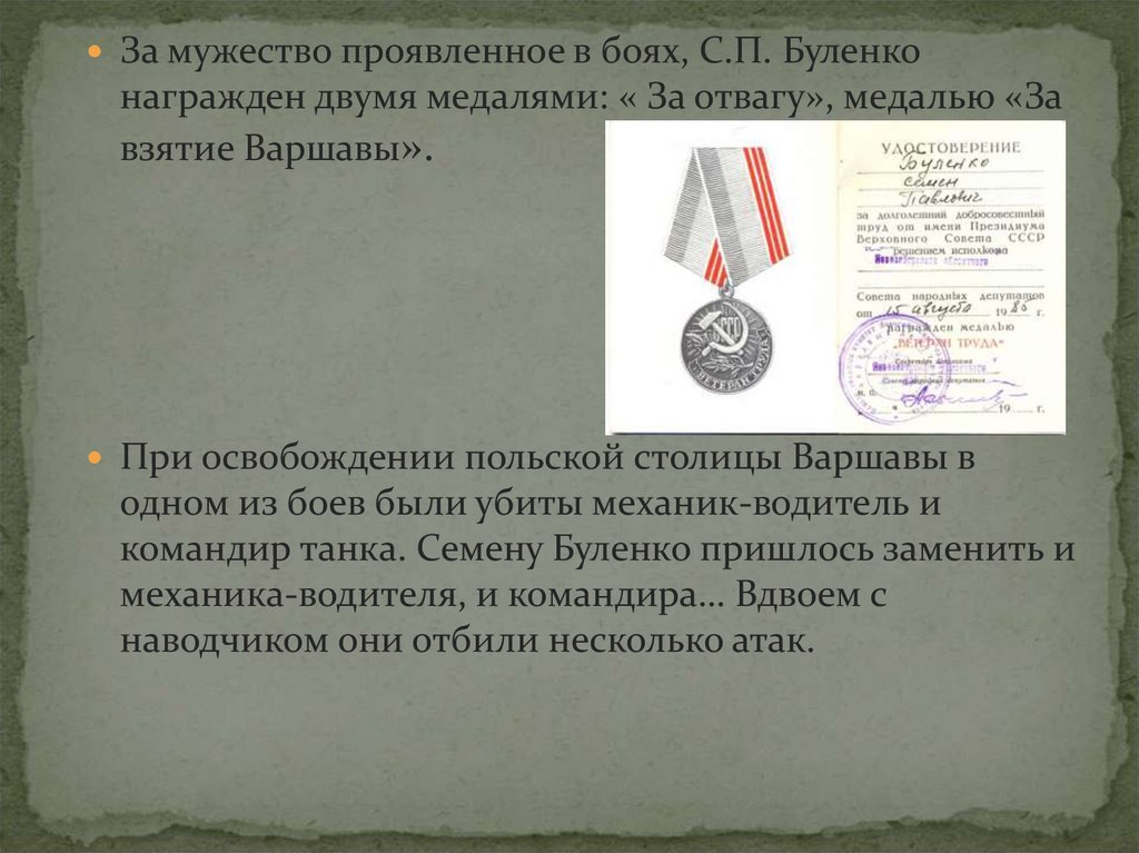 За мужество проявленное в боях, С.П. Буленконагражден двумя медалями: « За отвагу», медалью «За