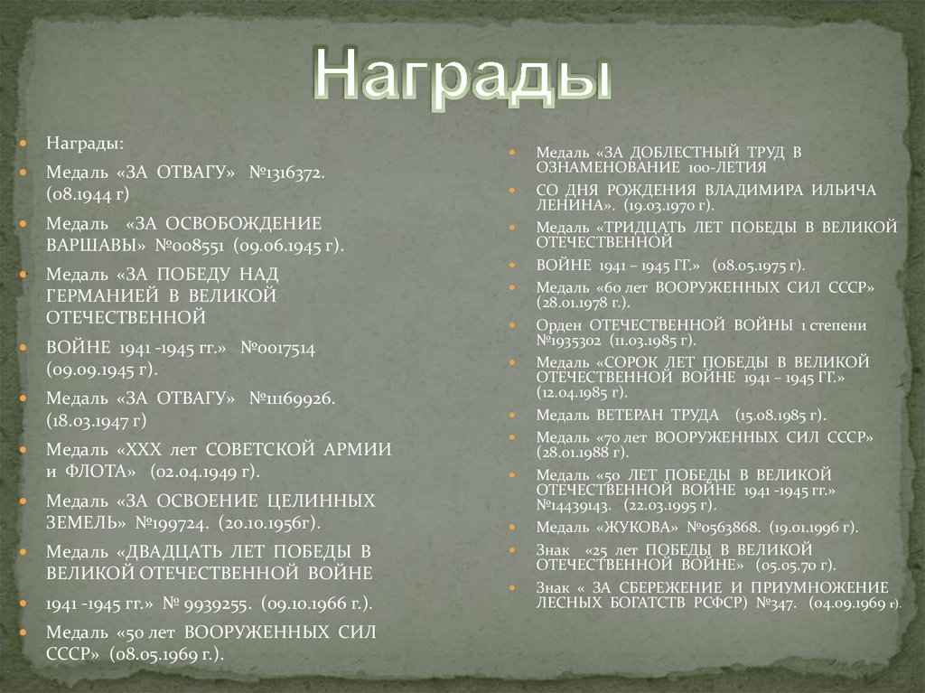 Награды:Медаль «ЗА ОТВАГУ» №1316372.