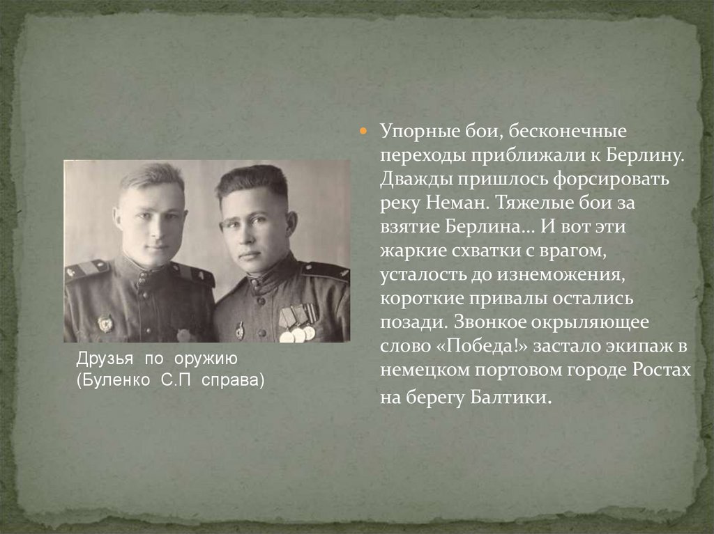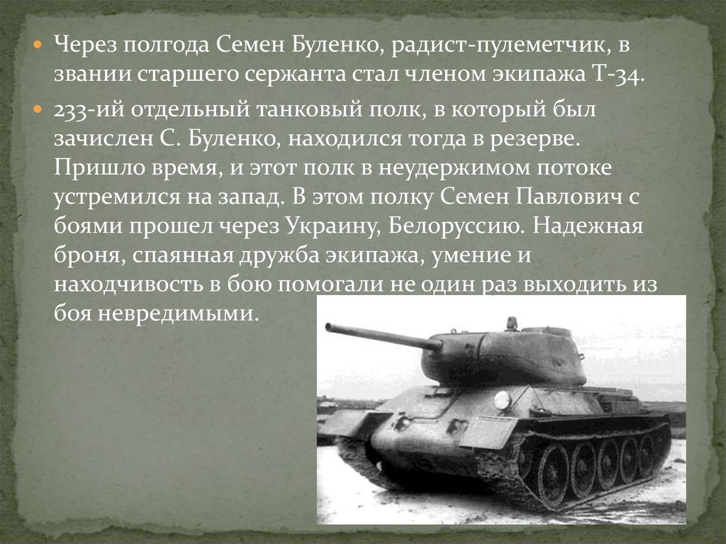 Через полгода Семен Буленко, радист-пулеметчик, взвании старшего сержанта стал членом экипажа Т-34.