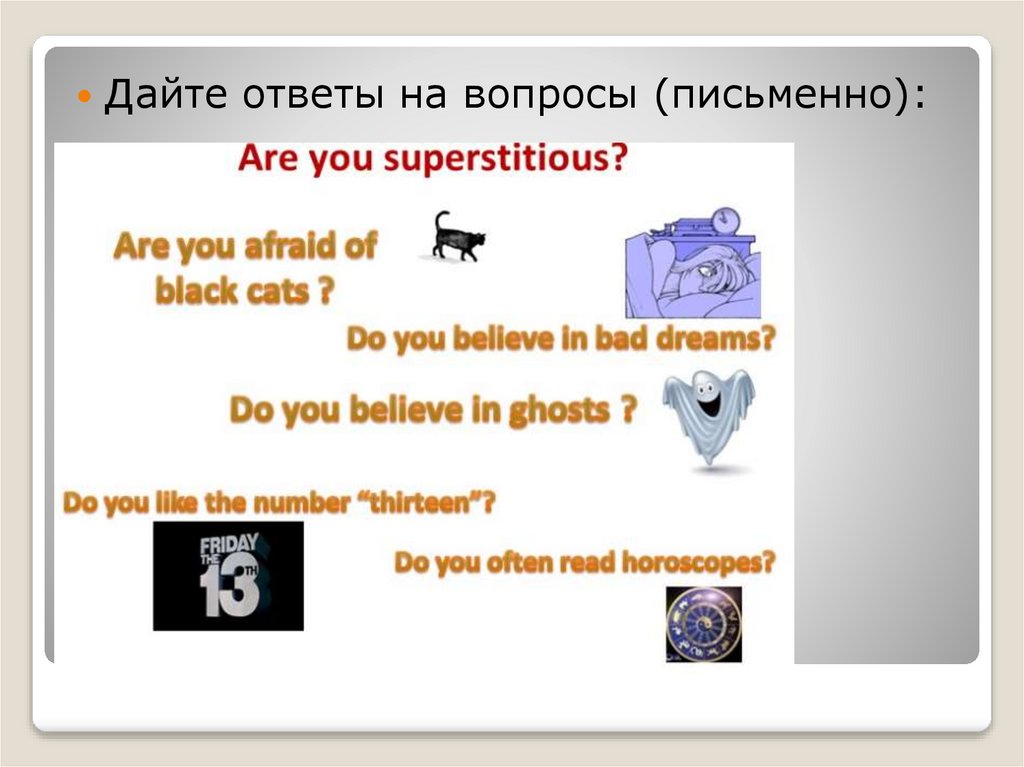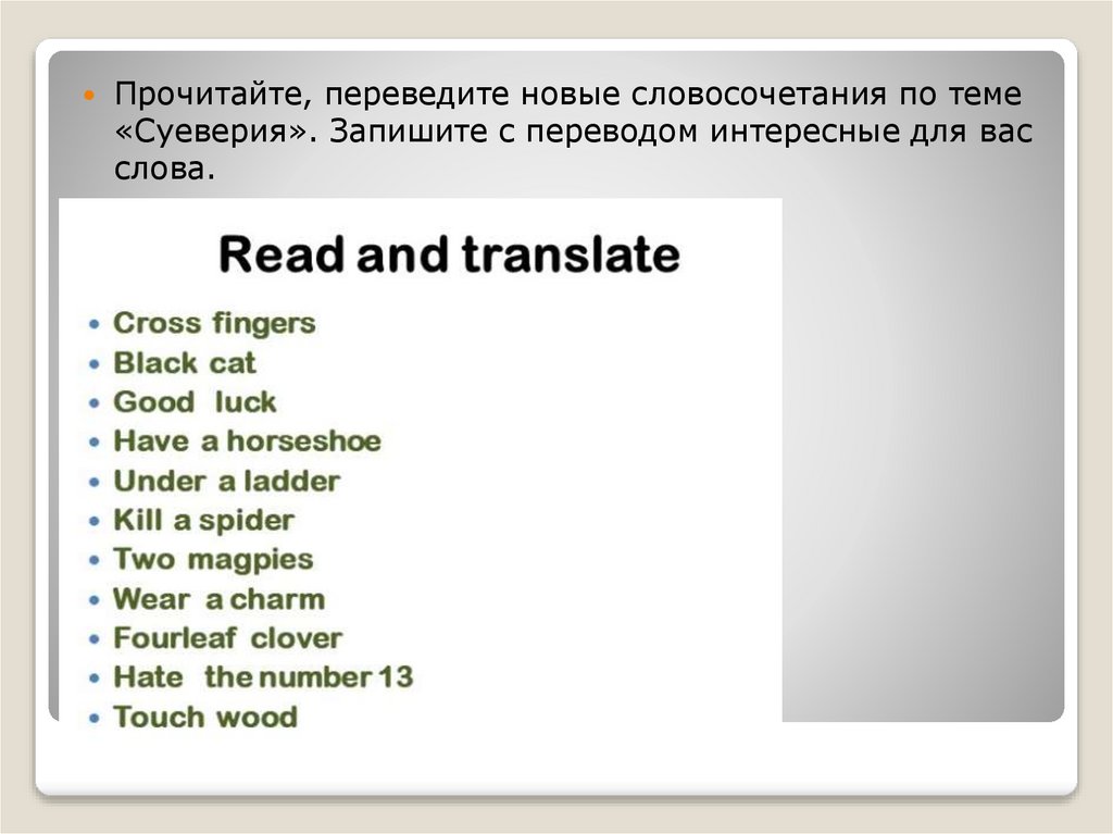 Прочитайте, переведите новые словосочетания по теме«Суеверия». Запишите с переводом интересные для вас