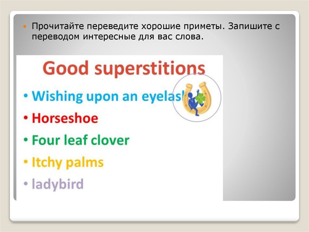 Прочитайте переведите хорошие приметы. Запишите спереводом интересные для вас слова.