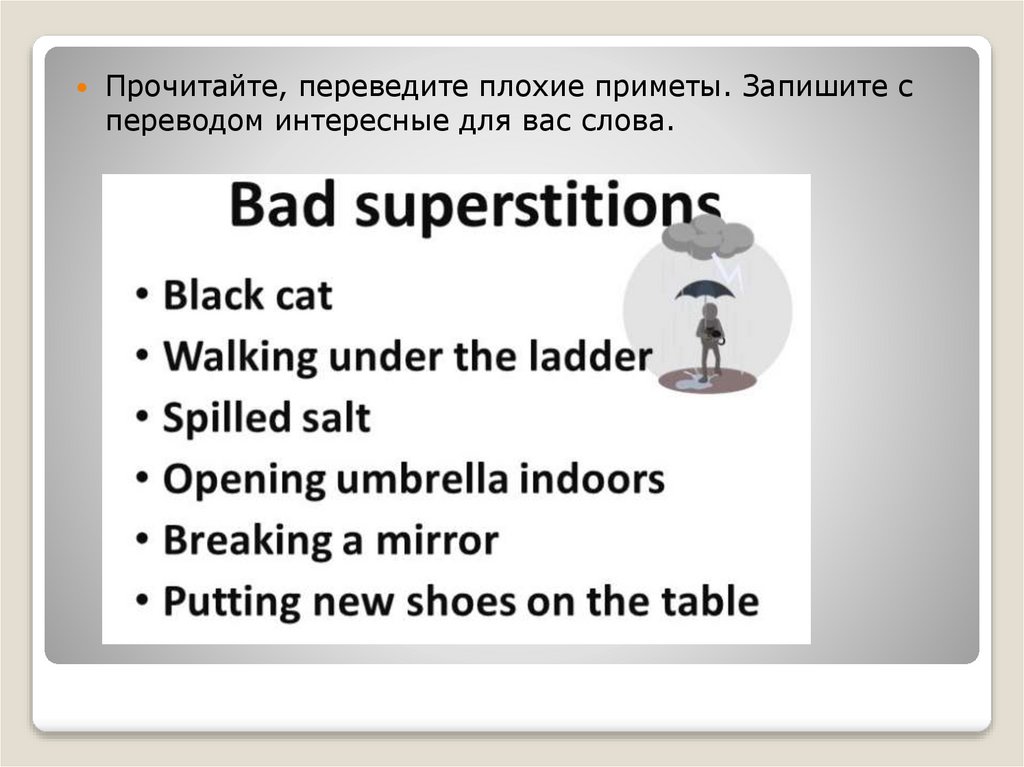 Прочитайте, переведите плохие приметы. Запишите спереводом интересные для вас слова.