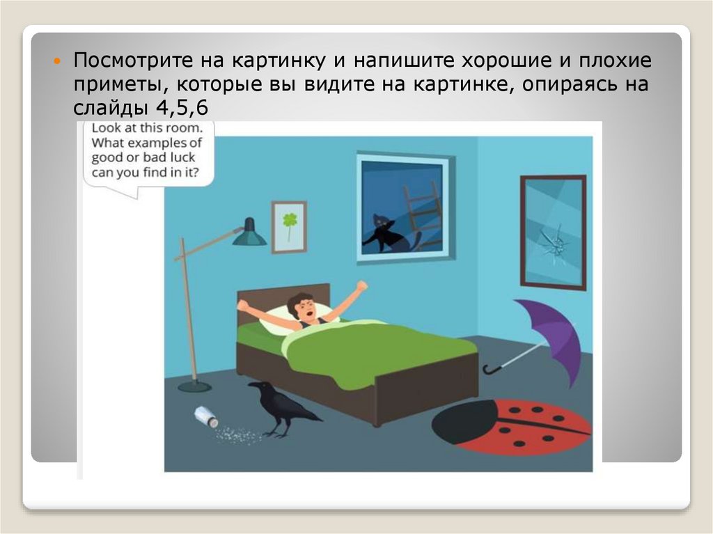 Посмотрите на картинку и напишите хорошие и плохиеприметы, которые вы видите на картинке, опираясь на