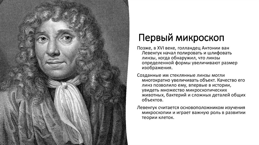 Первый микроскопПозже, в XVI веке, голландец Антонии ван
