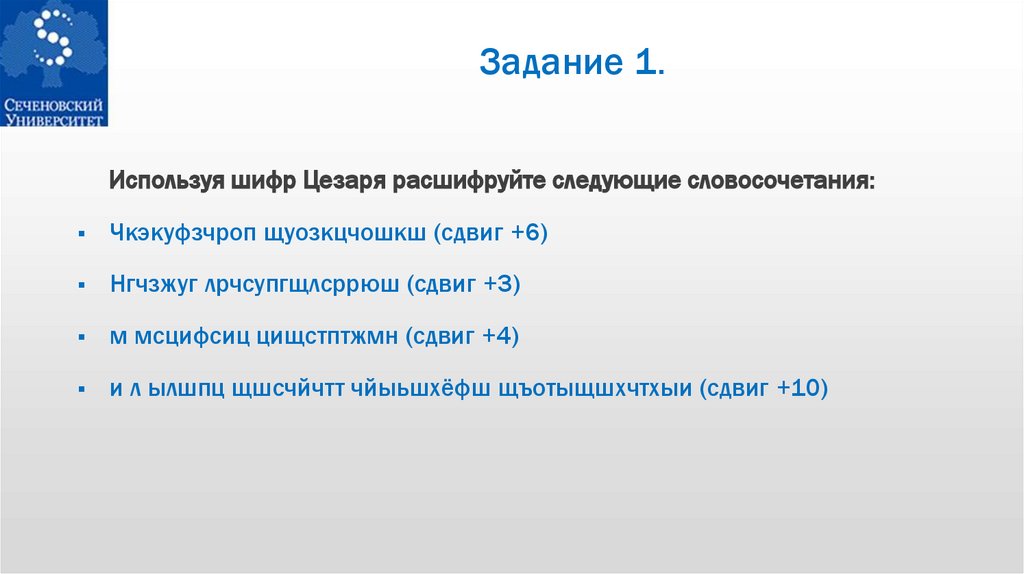 Задание 1.Используя шифр Цезаря расшифруйте следующие словосочетания: