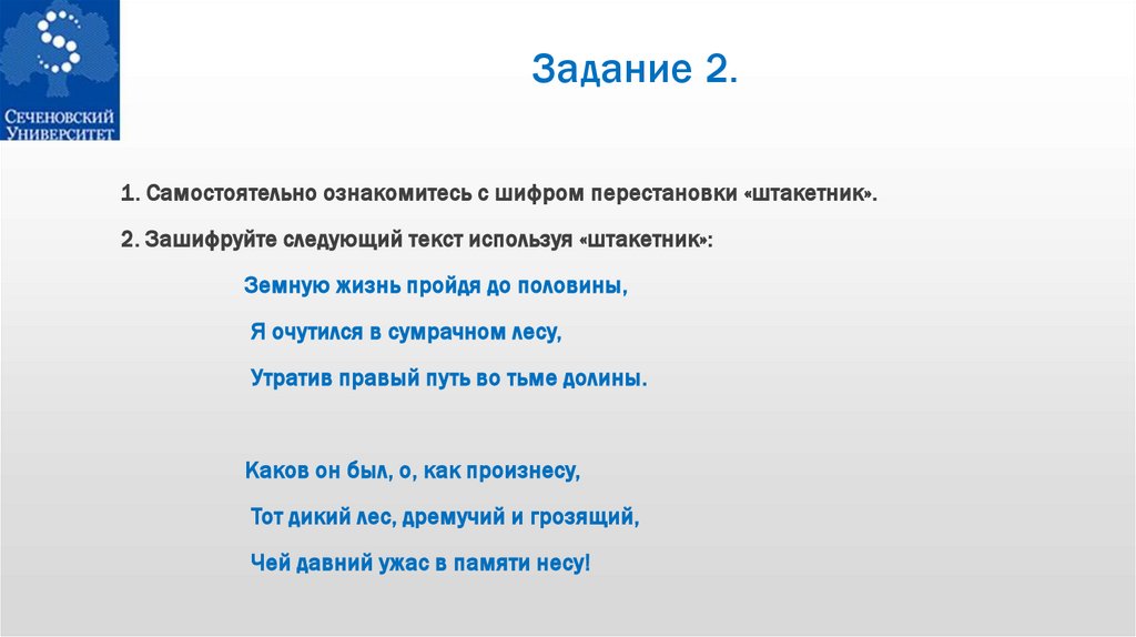 2. Зашифруйте следующий текст используя «штакетник»: