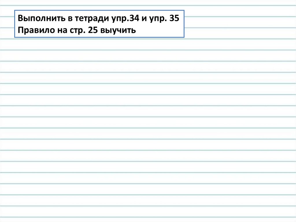 Выполнить в тетради упр.34 и упр. 35Правило на стр. 25 выучить