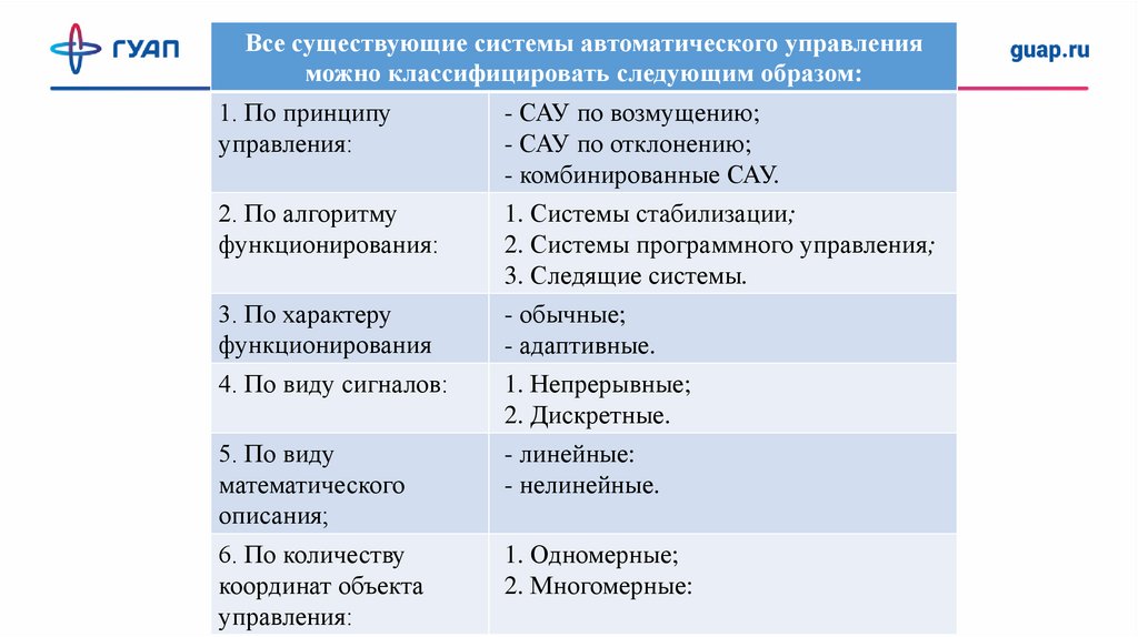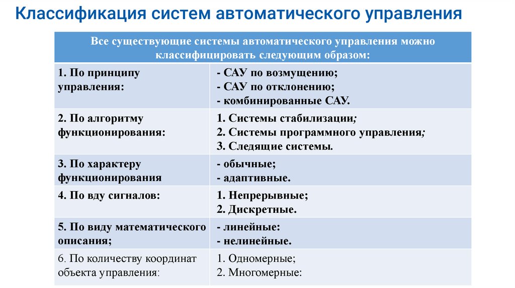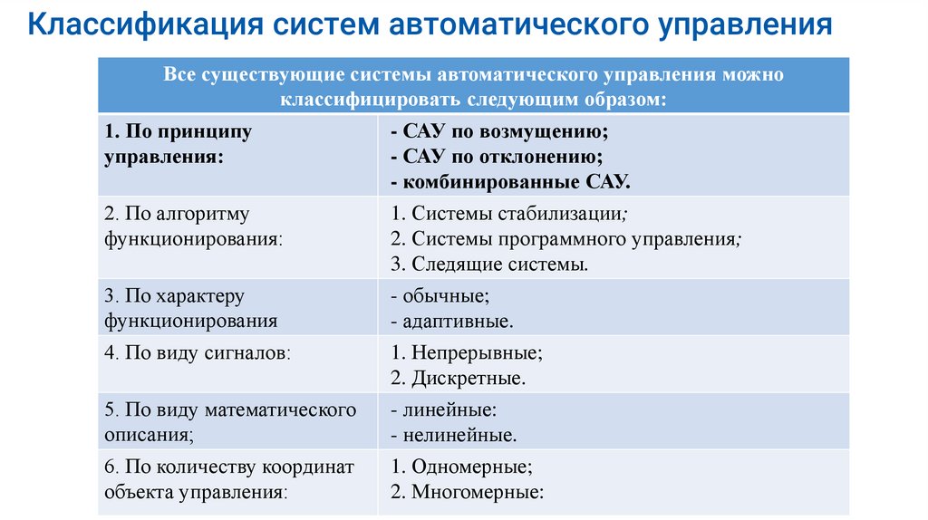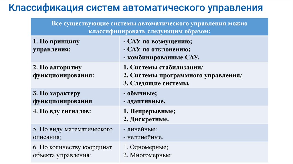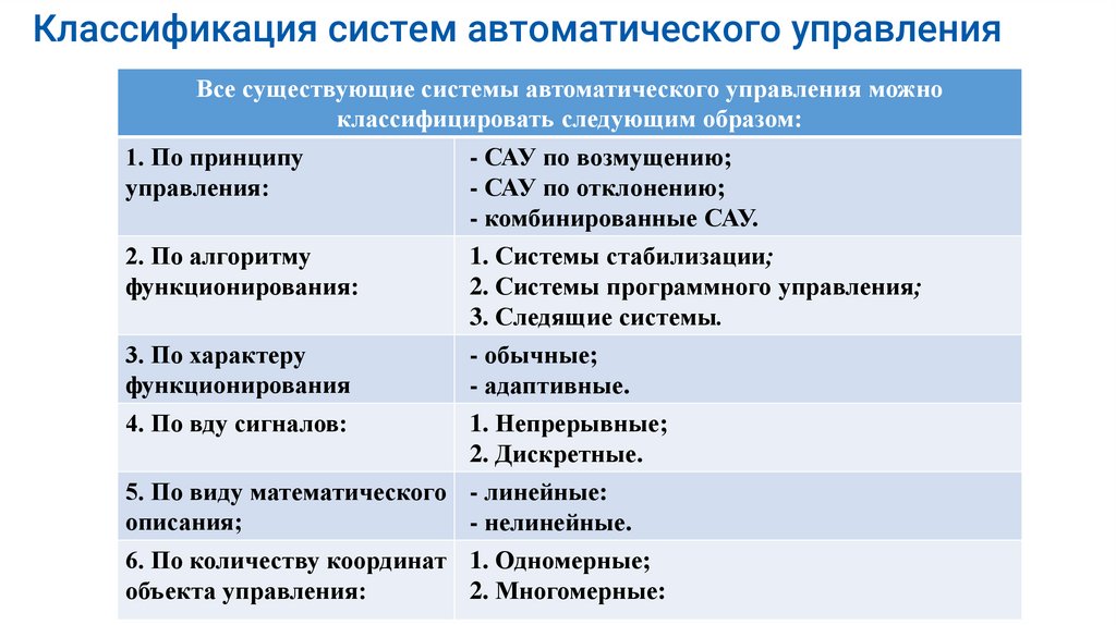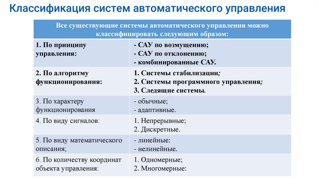 Все существующие системы автоматического управленияможно классифицировать следующим образом: