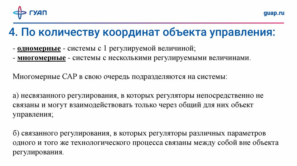 4. По количеству координат объекта управления:- одномерные - системы с 1 регулируемой величиной;