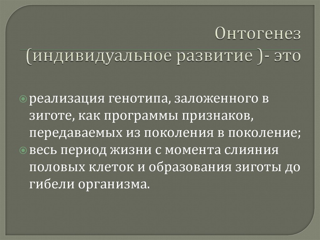 реализация генотипа, заложенного взиготе, как программы признаков,