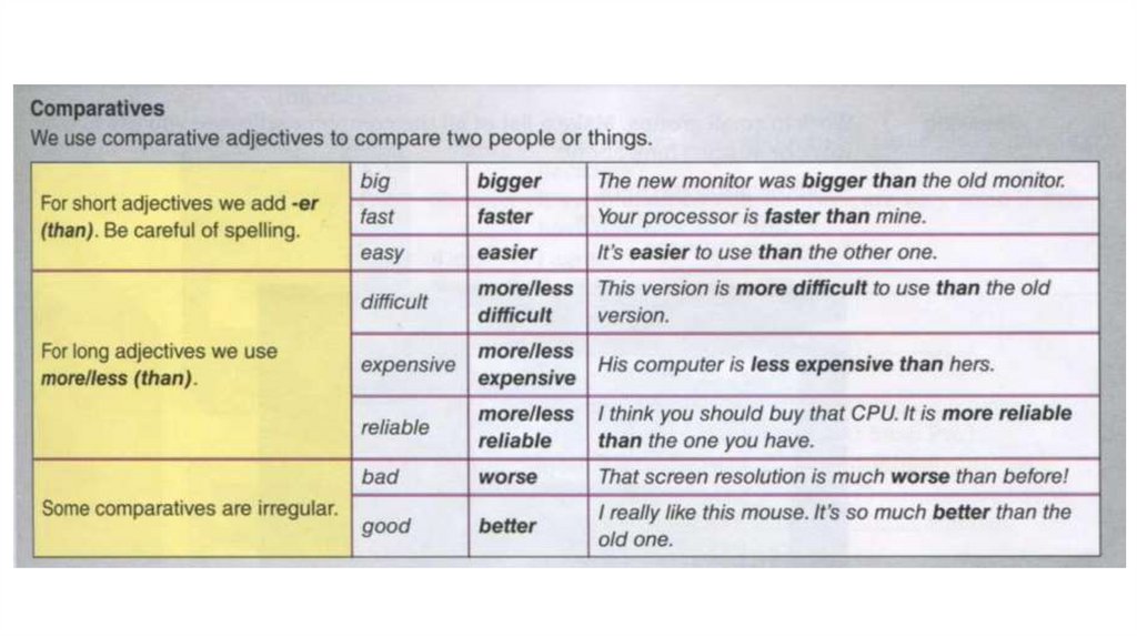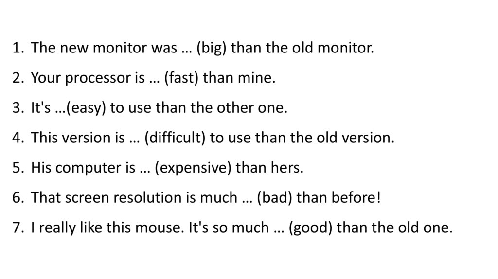 1. The new monitor was … (big) than the old monitor.2. Your processor is … (fast) than mine.
