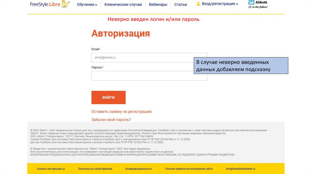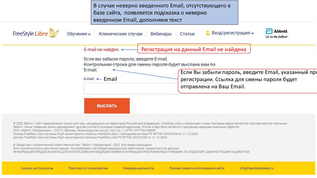 В случае неверно введенного Email, отсутствующего вбазе сайта, появляется подсказка о неверно