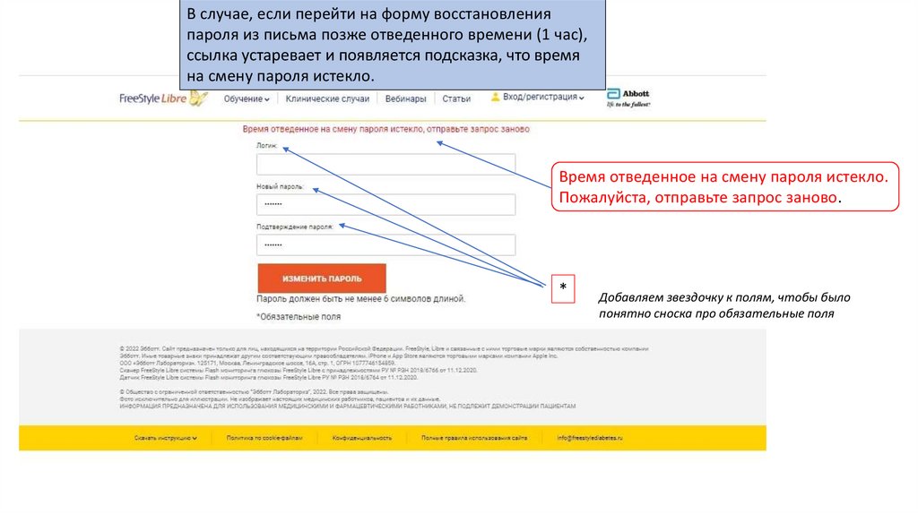В случае, если перейти на форму восстановленияпароля из письма позже отведенного времени (1 час),