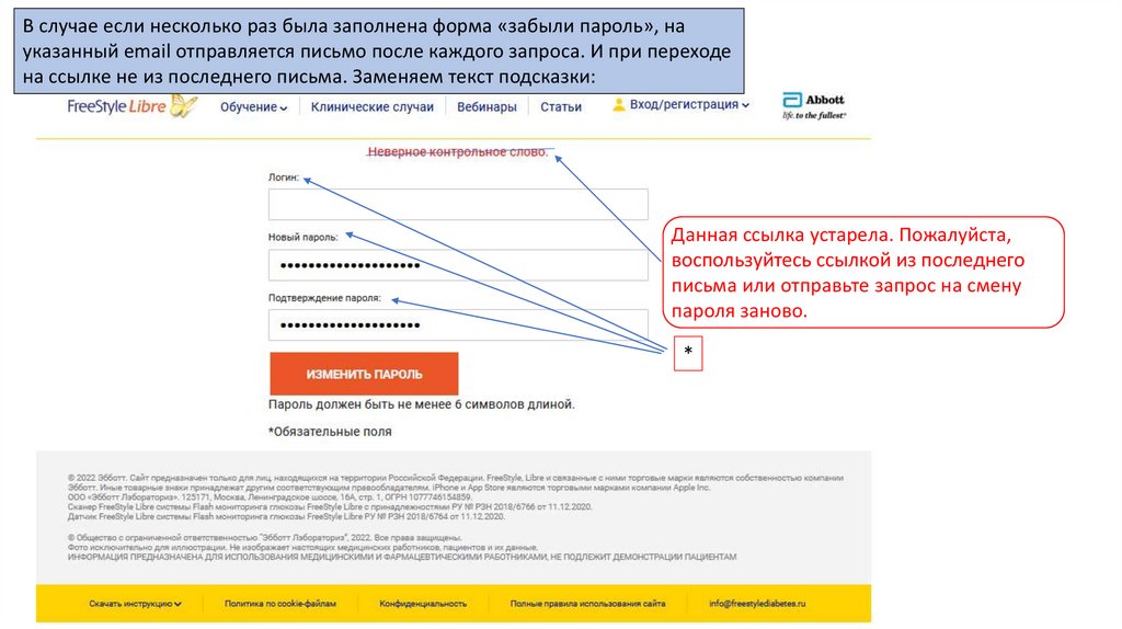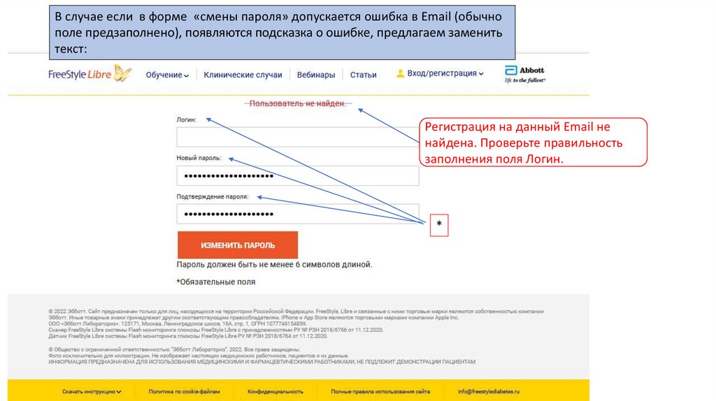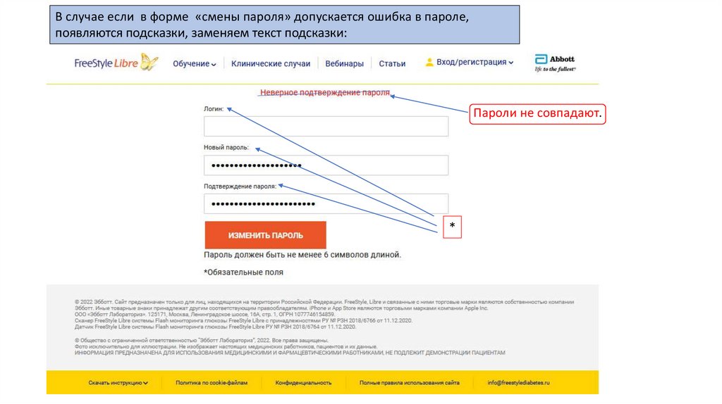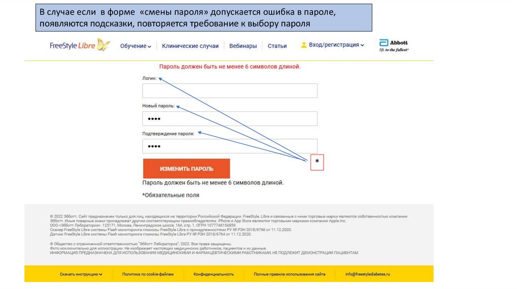 В случае если в форме «смены пароля» допускается ошибка в пароле,появляются подсказки, повторяется требование к выбору пароля