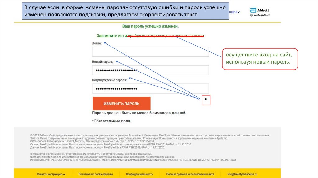 В случае если в форме «смены пароля» отсутствую ошибки и пароль успешноизменен появляются подсказки, предлагаем скорректировать текст: