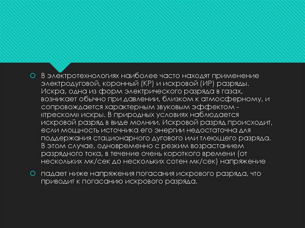 В электротехнологиях наиболее часто находят применениеэлектродуговой, коронный (КР) и искровой (ИР) разряды.