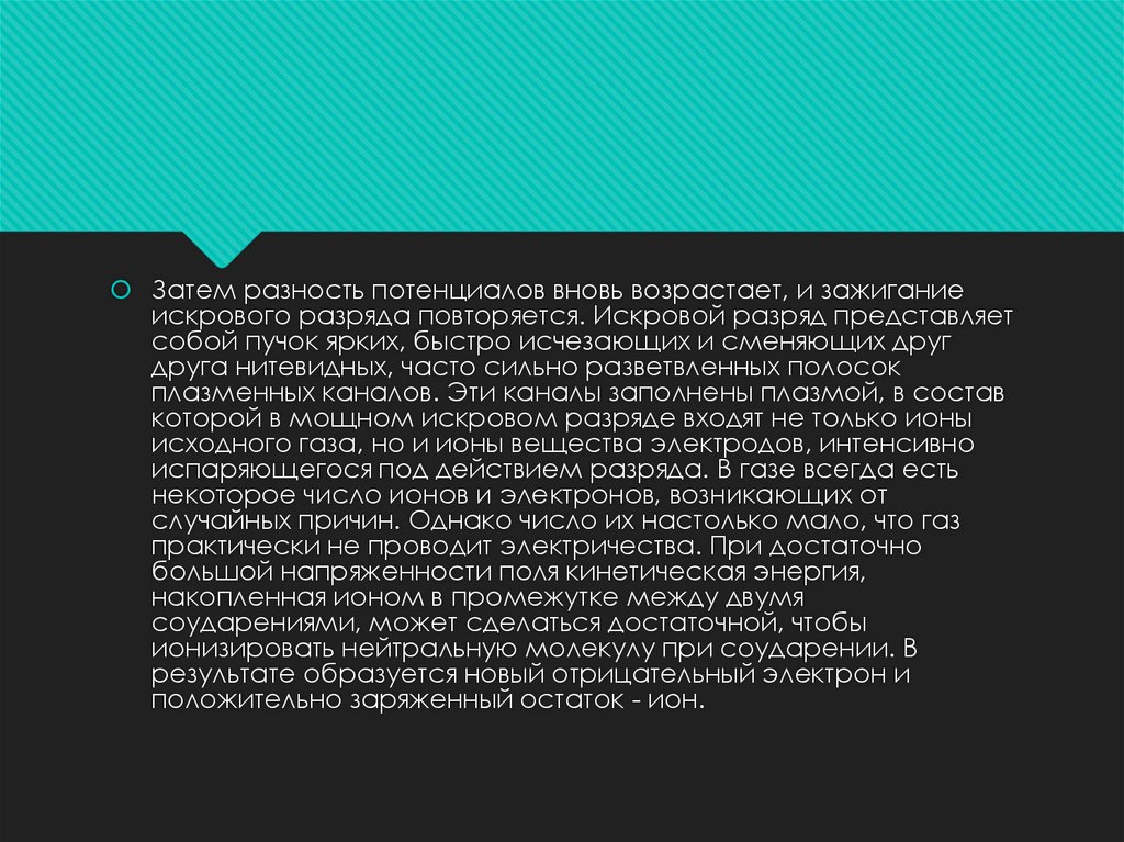 Затем разность потенциалов вновь возрастает, и зажиганиеискрового разряда повторяется. Искровой разряд представляет