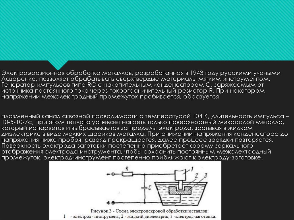 Электроэрозионная обработка металлов, разработанная в 1943 году русскими ученымиЛазаренко, позволяет обрабатывать сверхтвердые материалы мягким инструментом.