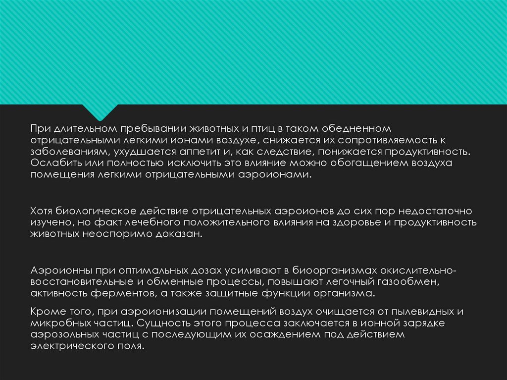 При длительном пребывании животных и птиц в таком обедненномотрицательными легкими ионами воздухе, снижается их сопротивляемость к