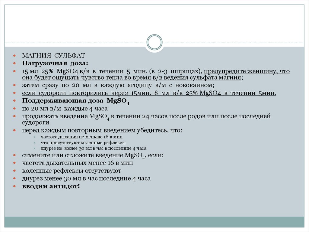 дозы MgSO4 в поликлинике, если данное состояние выявлено там, с