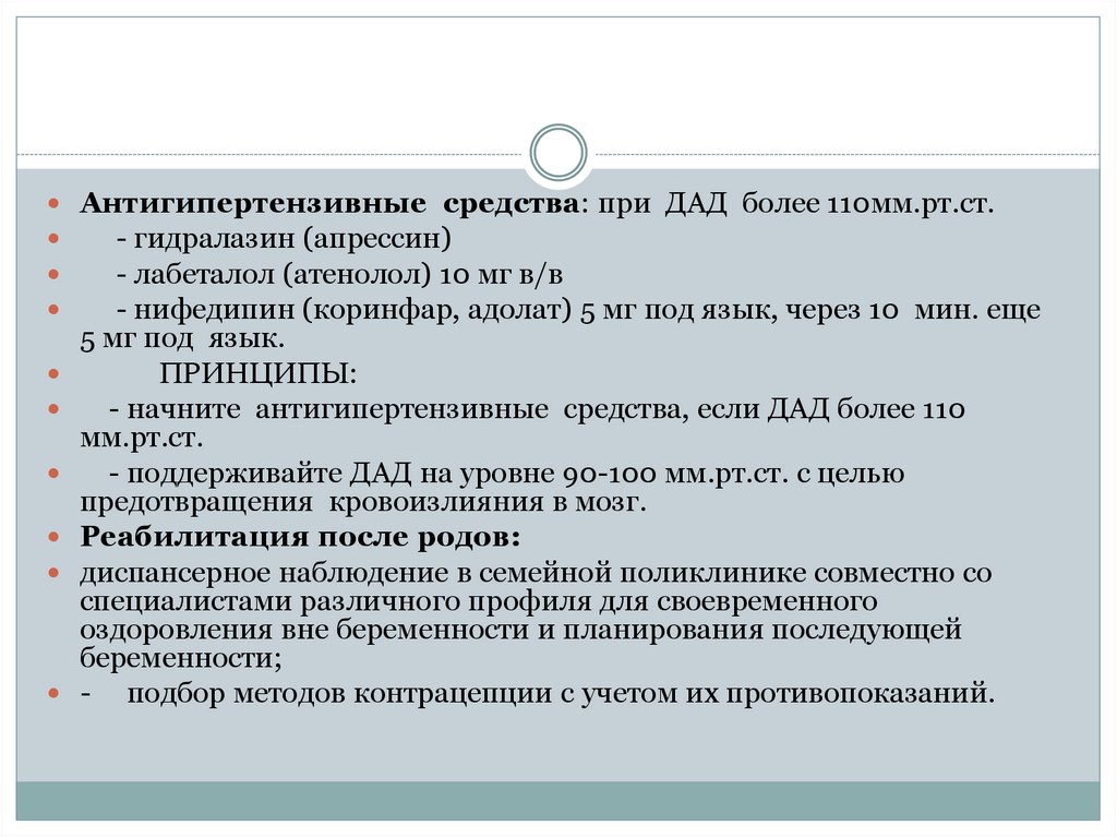 Антигипертензивные средства: при ДАД более 110мм.рт.ст.- гидралазин (апрессин)