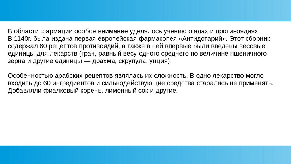 В области фармации особое внимание уделялось учению о ядах и противоядиях.В 1140г. была издана первая европейская фармакопея «Антидотарий». Этот сборник