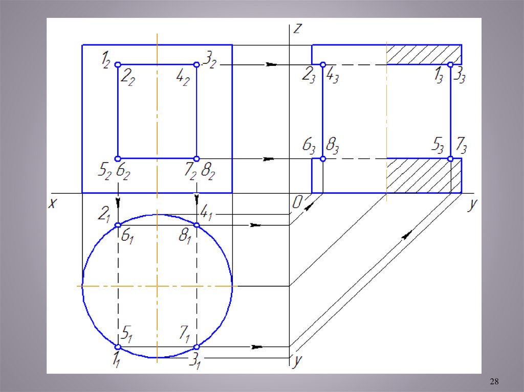 Построение недостающих проекций точек при помощивспомогательной прямой