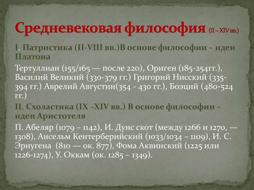 II. Схоластика (IX –XIV вв.) В основе философии –