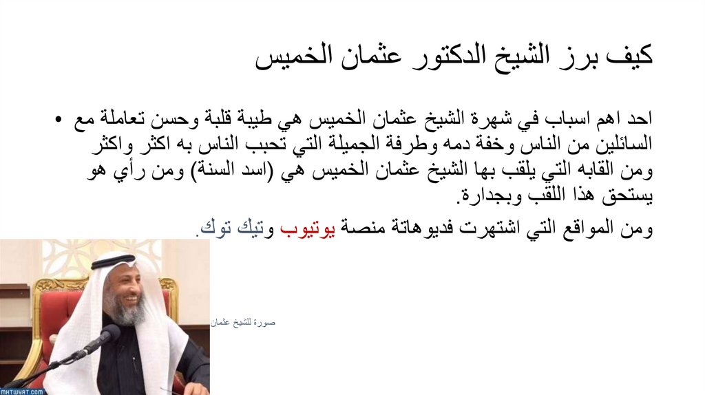كيف برز الشيخ الدكتور عثمان الخميساحد اهم اسباب في شهرة الشيخ عثمان الخميس هي طيبة قلبة وحسن تعاملة مع •