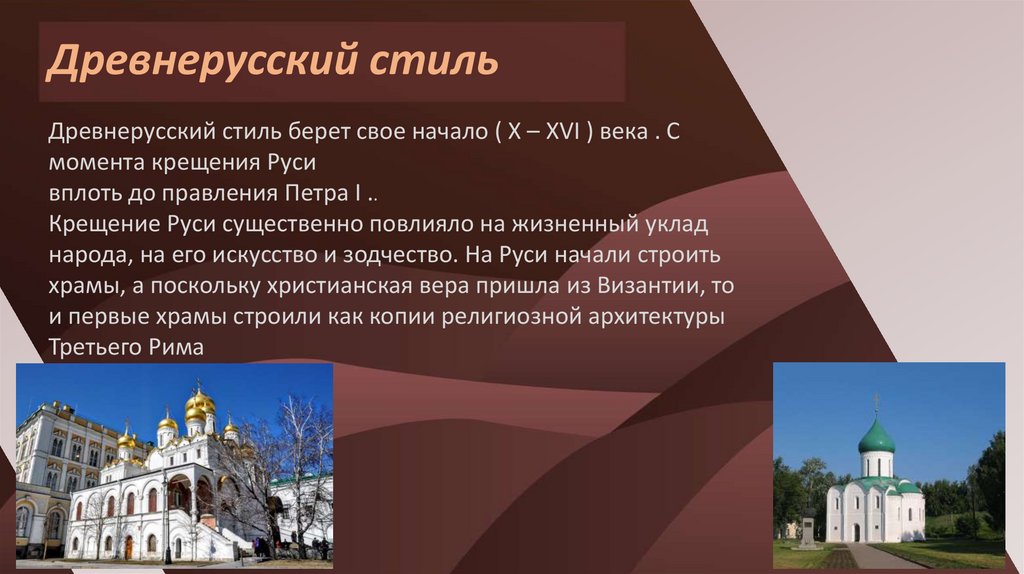 Древнерусский стильДревнерусский стиль берет свое начало ( X – XVI ) века . С