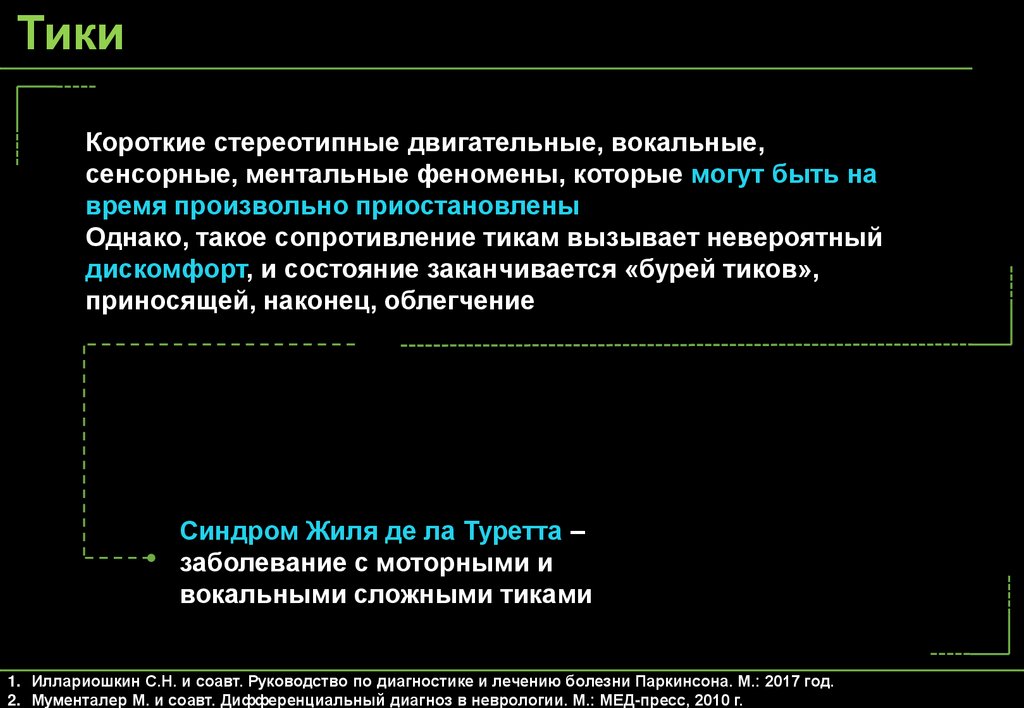 1. Иллариошкин С.Н. и соавт. Руководство по диагностике и лечению болезни Паркинсона. М.: 2017 год.