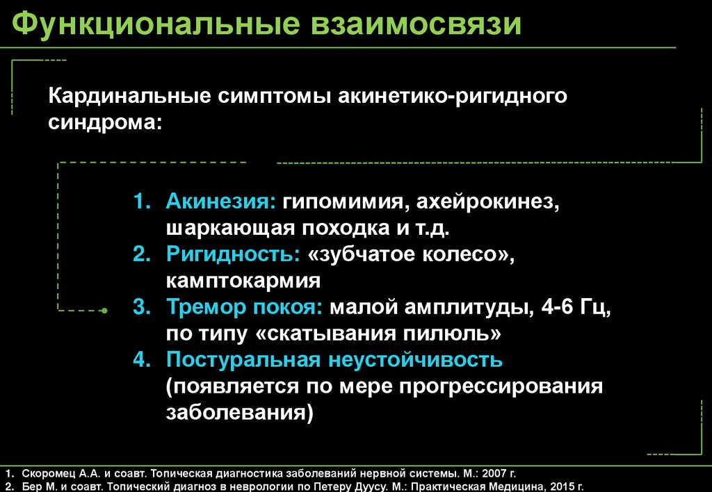 Функциональные взаимосвязиКардинальные симптомы акинетико-ригидного
