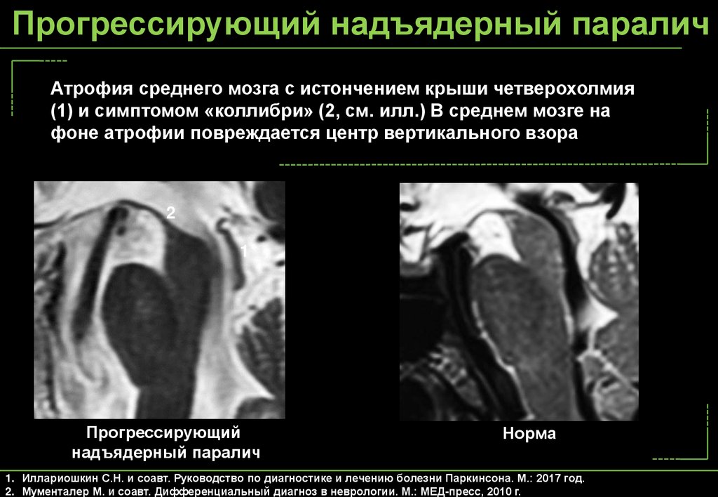 (1) и симптомом «коллибри» (2, см. илл.) В среднем мозге на