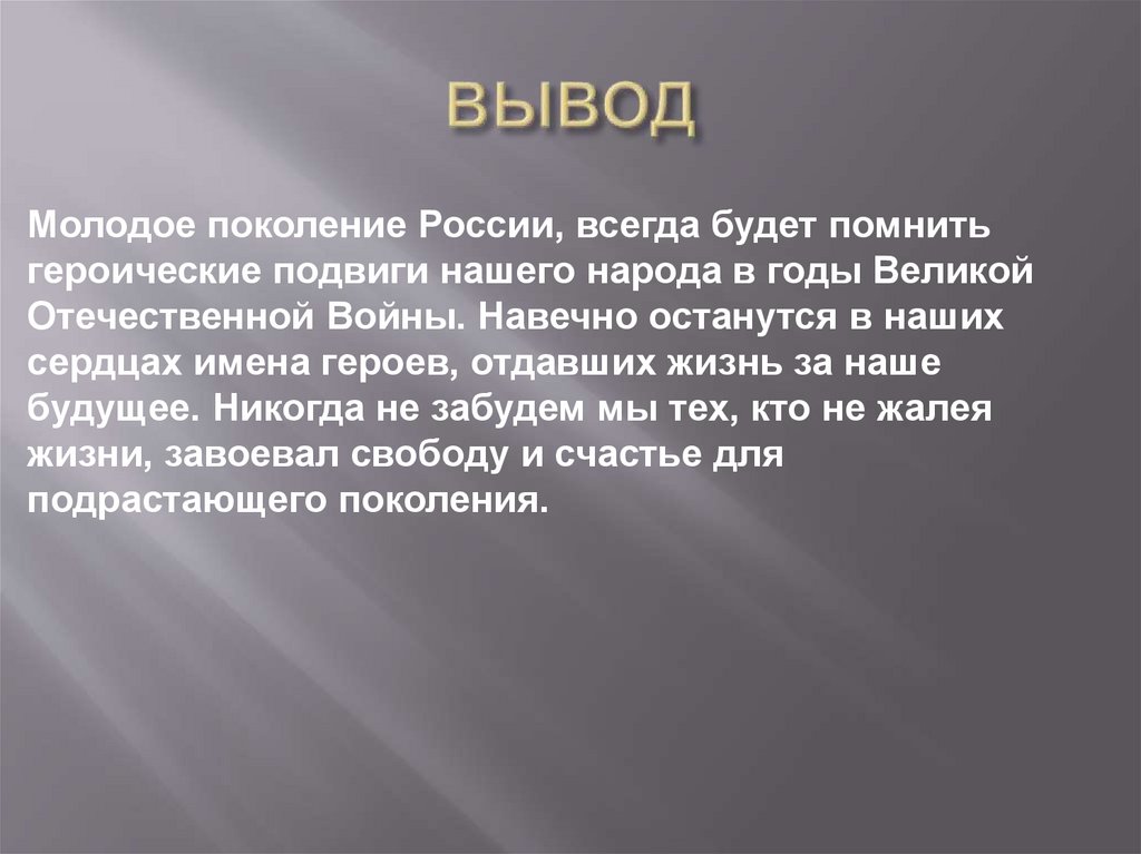 Молодое поколение России, всегда будет помнитьгероические подвиги нашего народа в годы Великой