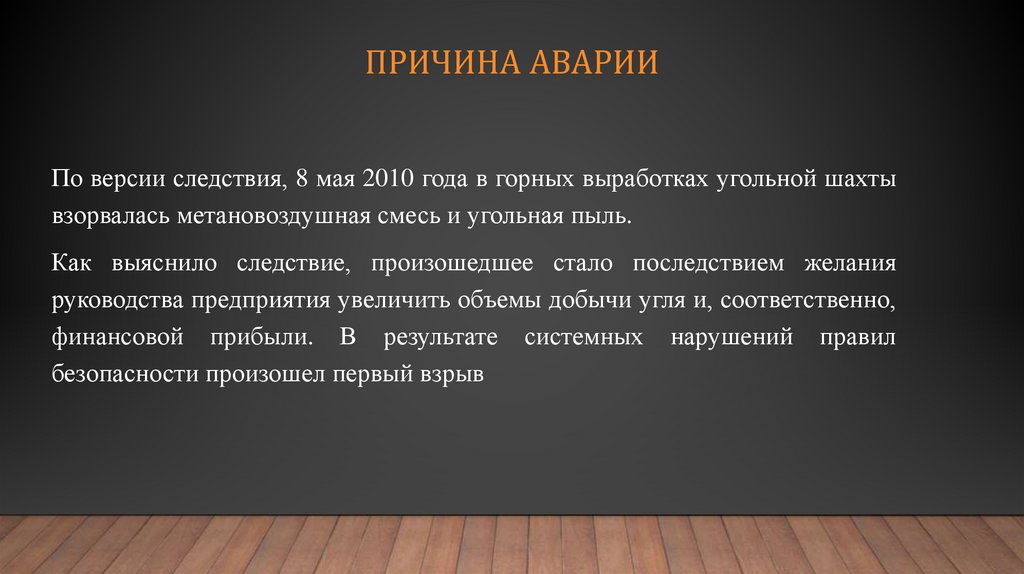 ПРИЧИНА АВАРИИПо версии следствия, 8 мая 2010 года в горных выработках угольной шахты