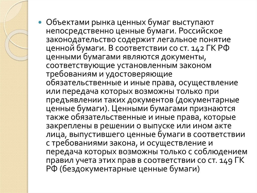 Объектами рынка ценных бумаг выступаютнепосредственно ценные бумаги. Российское