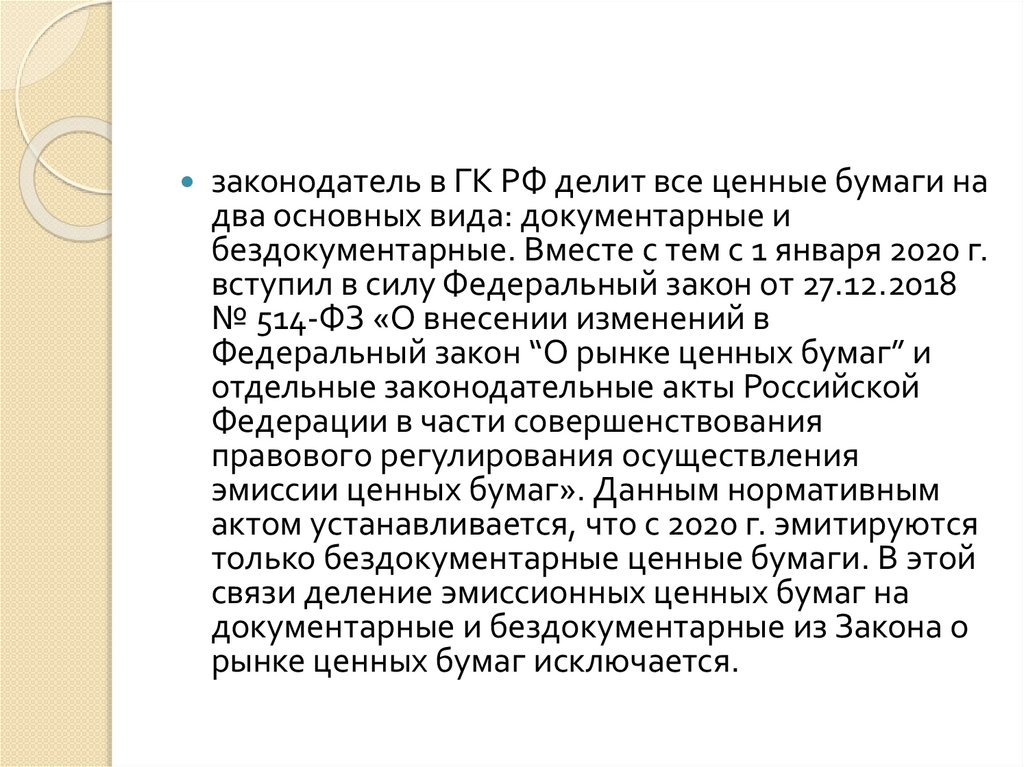 законодатель в ГК РФ делит все ценные бумаги надва основных вида: документарные и