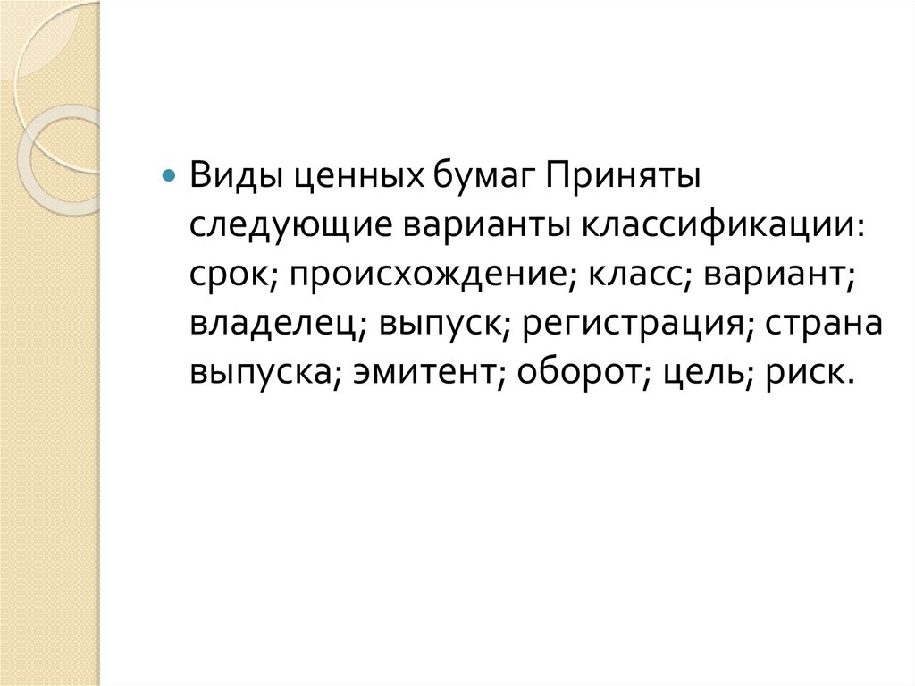 Виды ценных бумаг Принятыследующие варианты классификации: