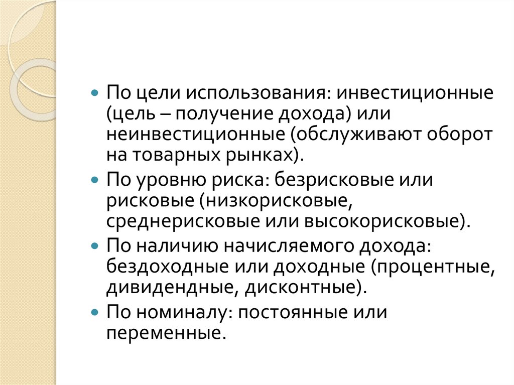 По цели использования: инвестиционные(цель – получение дохода) или